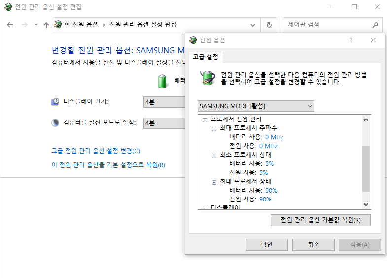최소는 기본 5%로 설정이 되어 있고, 최대 프로세서 상태만 90%까지 낮추어 두었다